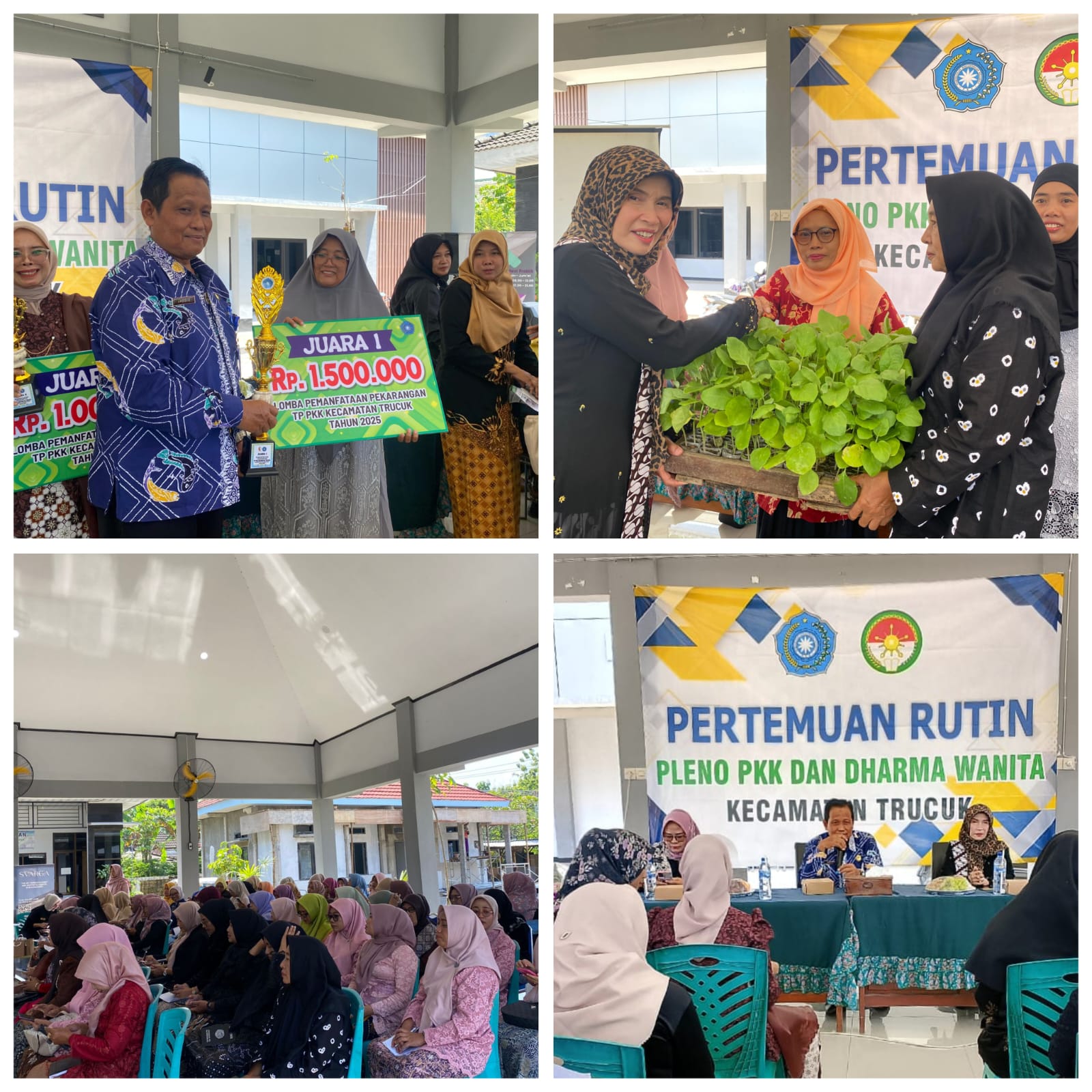 Trucuk, Bojonegoro- TP PKK Kecamatan Trucuk mengadakan pertemuan rutin yang dirangkai dengan peringatan HUT Dharma Wanita dan menyongsong Hari Ibu Tahun 2025 di Pendopo Kecamatan Trucuk, Jum'at (12/12/2025). Acara ini juga dimeriahkan dengan penyerahan hadiah lomba pekarangan antar desa se-Kecamatan Trucuk. Desa Guyangan keluar sebagai Juara I dengan hadiah Rp. 1.500.000, disusul Desa Trucuk Juara II (Rp. 1.000.000), dan Desa Banjarsari Juara III (Rp. 750.000). Desa Kandangan dan Desa Sumberejo masing-masing meraih Juara IV dan V dengan hadiah bibit sayuran. Kegiatan dihadiri Camat Trucuk, Ibu Ketua TP PKK, narasumber dr. Nia Clinik SVARGA, dan ibu-ibu Dharma Wanita, berlangsung lancar dan kondusif. (AKT)